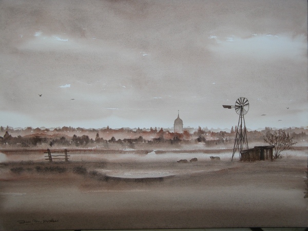 Aquarelle: ancienne éolienne située route du Grand Marais, commune de Bois de Cené 46 x 61 cm