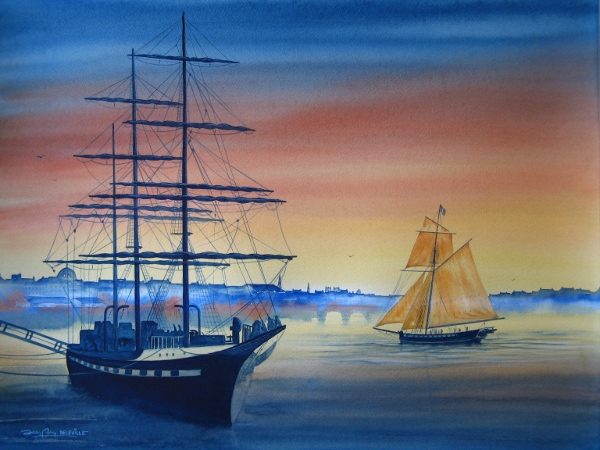 Aquarelle: Le Belem dans le port de Nantes 48 x 63 cm